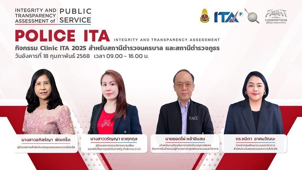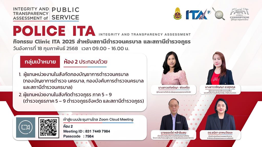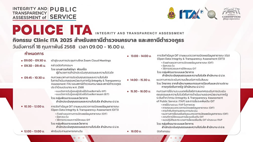 วันที่ 18 กุมภาพันธ์ 2568 เวลา 09.00 – 16.00 น. พ.ต.ต.เกียรติก้อง อันเตวาสิก สว.สภ.ยกกระบัตร พร้อมด้วย ร.ต.อ.สงเมือง ศรีกันหา และเจ้าหน้าที่ผู้รับผิดชอบตัวชี้วัด เข้าร่วมเฝ้าฟังกิจกรรม Clinic ITA 2025 สำหรับสถานีตำรวจนครบาลและสถานีตำรวจภูธร ประจำปีงบประมาณ พ.ศ. 2568 รูปแบบ online โดยมี นางสาวอภิสร์ญา พัดเกร็ด ผู้อำนวยการสำนักประเมินคุณธรรมและความโปร่งใส เป็นประธานในพิธีเปิด